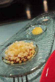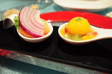 前菜燻鮭魚蘋果酸豆、芒果晶球水果沙沙